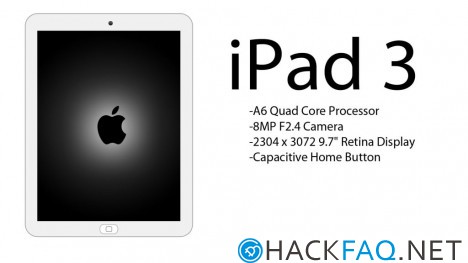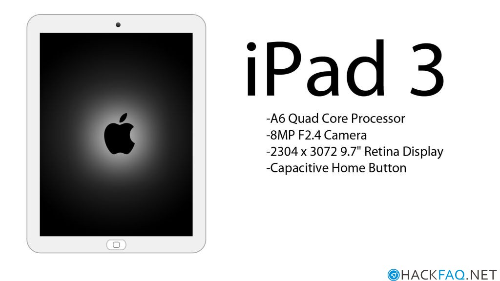 iPad 3 в данном случае укомплектован 4-ядерным процессором Apple A6, 8-мегапиксельной камерой с f/2.4 линзой, а также 9,7-дюймовым дисплеем Retina с разрешением 2304 на 3072 пикселей. Кроме того, есть 1 Гб оперативной памяти и 2-мегапиксельная фронтальная камера для Facetime. Устройство должно выйти в трех вариантах: 16 Гб, 32 Гб и 64 Гб.