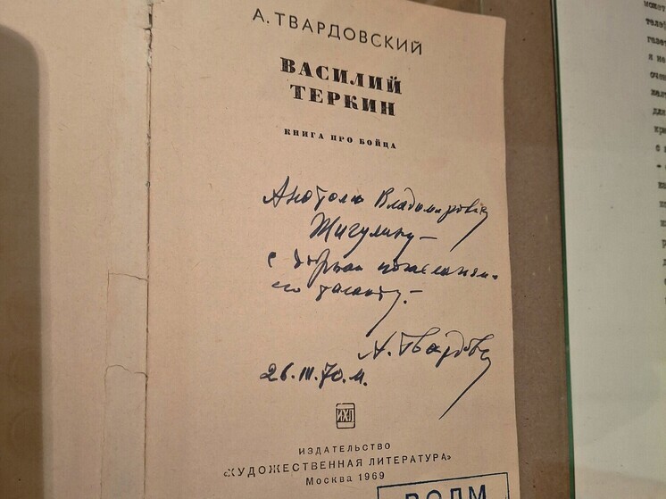 1. Послевоенное издание «Василия Теркина» с дарственной надписью рукой автора: «Анатолию Жигулину с добрыми пожеланиями его таланту»;
