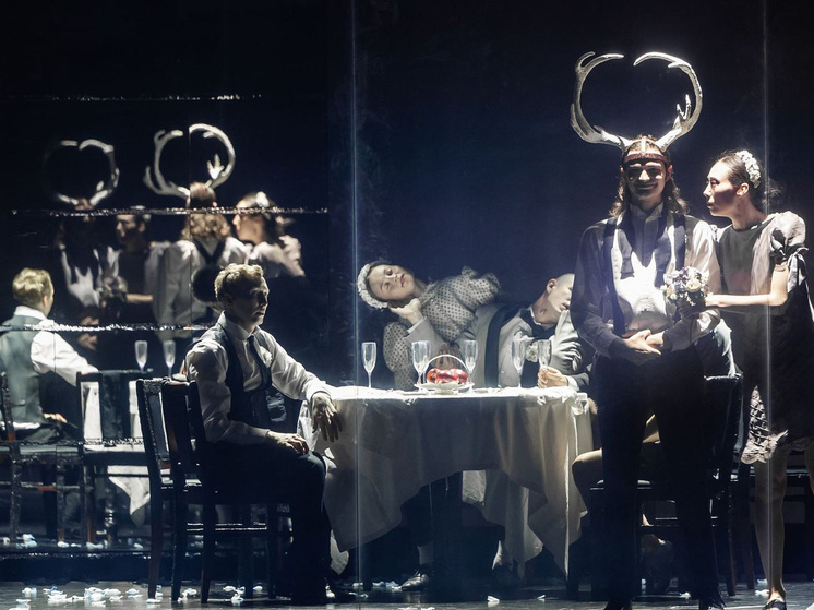 Режиссер Анна Гусева и художник Юлия Орлова построили многослойное пространство: в расположенных наверху двух гигантских аквариумах демонстрируется реальный земной быт. Впрочем, не такой уж и реальный. Вот, казалось бы, веселая свадьба, но на ней вдруг появляется рогатый человек. Вот тоскующая женщина, раздраженно отталкивающая собственного ребенка и сующая голову в газовую духовку. Вот писатель, дающий автографы своим поклонникам с одинаковыми не вполне человеческими лицами. Вот женщина с чемоданом в руках в бесконечном беге. А вот и вовсе эпизод на грани: дети на празднике показывают «живые картины». Благодаря специальной системе зеркал на самом верхнем уровне мы видим, как их наряжают. А затем они появляются перед импровизированной занавеской-простыней. Только вот что это за образы? Мальчик, пронзенный стрелами, как св. Себастьян, девочка с отрубленной головой в руках — как Саломея…