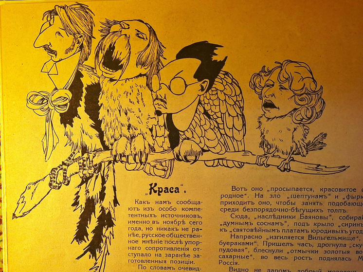 «Черный человек/Черный, черный/Черный человек/На кровать ко мне садится…» Кстати, недавно «МК» подробно выяснял обстоятельства первого выступления Есенина в 1915 году на вечере «Краса». Так вот на выставке представили журнальный (отнюдь не комплиментарный) отзыв на «Красу». В нем упоминается, что на вечере в концертном зале Тенишевского училища, «по словам очевидцев», «добрый молодец, млад-Есенин из Рязани потряхивал кудрями русыми, приплясывал ножками резвыми…» Причем к статье присовокупили карикатуру на основных участников, где Есенина изобразили в виде… неоперившегося воробушка.