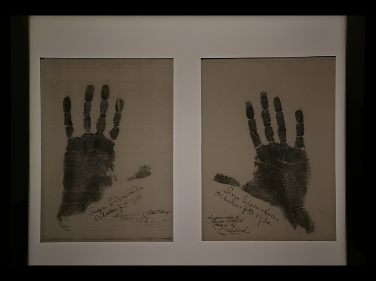 Эйзенштейн — вне съемочной площадки. Любопытный зал, связанный с внерабочей жизнью режиссера, и, пожалуй, самый удивительный прежде всего экспонатом, который надо еще постараться найти. В выдвижном ящичке скрывается фотокопия отпечатка ладоней Эйзенштейна, которую он в 1930 году показывал хироманту — тот предсказал, что по возвращении на родину жизнь его там будет недолгой. Еще один экспонат, пожалуй, забавный — табель с успеваемостью Эйзенштейна с двойкой по чистописанию и тройкой по рисованию.