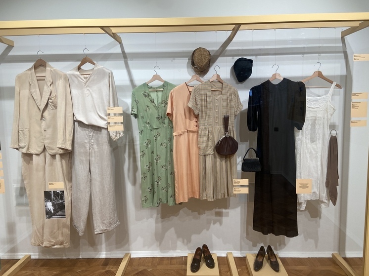 Самые интересные экспонаты, конечно, одежда — буквально прогулка москвичей в приятный теплый денек в 1930-е годы! Пара летних мужских комбо — летний костюм-двойка, а также мужские хлопковые брюки с шелковой рубашкой. У мужчин, как и сегодня, кажется, костюм-двойка был идеальным вариантом для города, чтобы произвести благоприятное впечатление. Актуально и в наши дни для жарких дней — современные мужчины летом тоже любят светлые хлопковые костюмы, которые уместно смотрятся и в городской среде, и где-нибудь на морском курорте.
