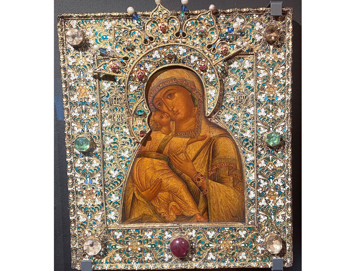 Каждый из шести предметов иллюстрирует этап развития искусства работы с эмалью в XVII веке. Икона «Богоматерь Владимирская» изготовлена в Оружейной палате Московского Кремля — на ней мы можем увидеть тончайшую технику создания узоров. Они выполнены с помощью серебряных и золотых нитей, свернутых в жгут или представленных в виде ленточки. Получившийся контур узора внутри заполняется эмалевым порошком. Эффект потрясающий — фон иконы словно цветущий сад, переливающийся на солнце. Эта икона первая, которую мы увидим, зайдя на экспозицию. Многие подумают, что она выложена драгоценными камнями, но это транспарантная (прозрачная) эмаль. Она пропускает через себя свет и действительно обладает блеском, похожим на сияние драгоценных камней.