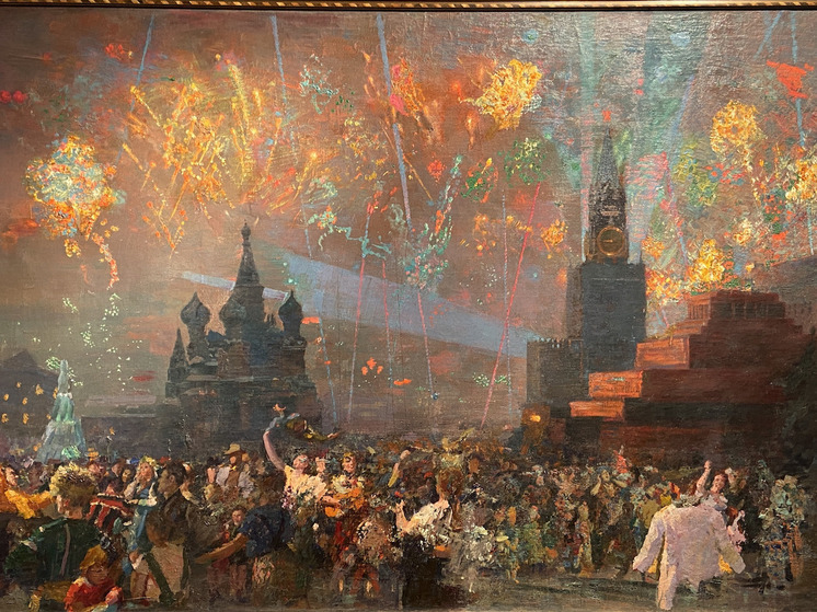 В первом зале экспозиции «Сорок пять сорок пятого. Искусство радости» бросается в глаза картина Бориса Иогансона «Салют Победы». 9 мая 1945 года в Москве в честь Победы прозвучали 30 залпов из 1000 орудий. Размах народного ликования и отразился в хрестоматийном полотне художника. Картина яркая, праздничная — на Красную площадь высыпала толпа, кто поет под гитару, кто кричит, кто обнимается… Война закончилась!!! Но в то же время возникает вопрос: как жить дальше? Какой будет жизнь после Победы? Ведь жизнь совсем другая. Не было ни одной семьи, которая не столкнулась бы с горечью и ужасом потерь. И об этом здесь напоминает скульптурный портрет Елизаветы Чайкиной, выполненный Николаем Томским. Смелый и твердый взгляд девушки, защитницы. В ноябре 1941 года партизанку схватили фашисты и пытали — хотели узнать расположение партизанского отряда. Чайкина вынесла все мучения, не сдала своих. 23 ноября 1941 года ее расстреляли. У Томского целая серия работ, посвященных героям войны, но Лиза Чайкина занимает особое место. И таких жертв миллионы — как жить дальше?
