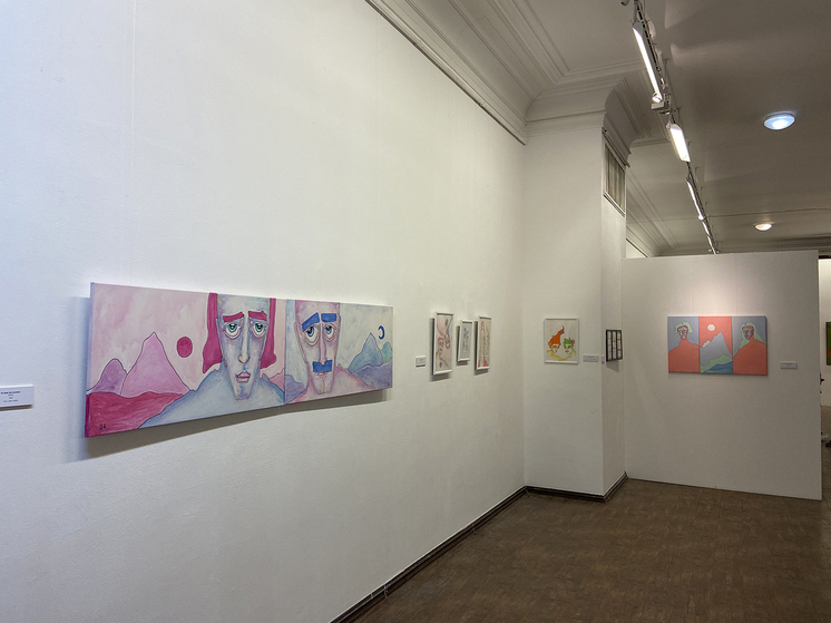 В зале с рисунками кажется, что ты в окружении людей, выросших из гор, — фигуры персонажей словно врастают в землю, но их лица… Это те же взгляды — удивленные, потерянные, усталые, задумчивые, мечтательные… Интересно колористическое решение: кажется, что работы греют своего зрителя, обнимают нас, такой эффект создается прежде всего за счет цветов — преобладают теплые оттенки. Но любопытно и другое: даже там, где преобладают холодные тона, они не кажутся таковыми, не добавляют льда, не посыпают нас горным снегом с вершин. Все рисунки созданы с грузинским солнцем и с согревающей любовью к людям. И это большое чудо, ведь нечасто возле картин можно по-настоящему согреться.