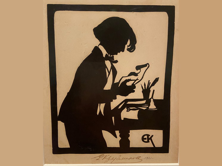 Совсем другая Кругликова в собственном представлении — в небольшом и прелюбопытнейшем автопортрете. Художница изображает себя за работой, с бумагой и ножницами в руках. Со лба упала пара прядей волос. В силуэте движение ощущается настолько, что кажется, она сейчас элегантно откинет локоны и продолжит работу. Кого же она вырезает именно на автопортрете — остается догадываться. Но вообще героями ее силуэтов часто становились друзья — литераторы, художники…Кстати, тот же Волошин. Здесь есть и его автопортрет.