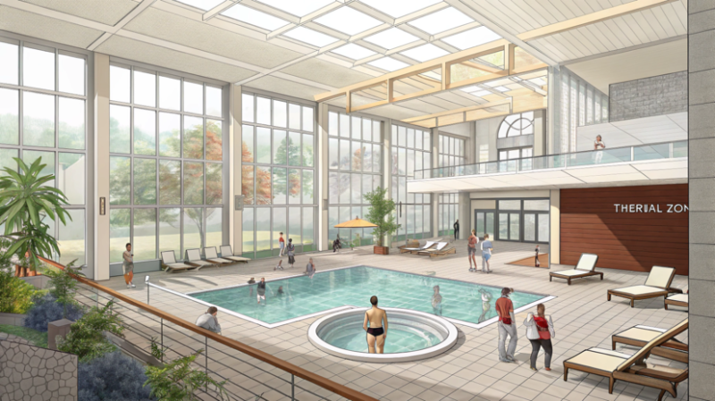 В аквазоне разместят крытый и открытый бассейны, оборудуют банный комплекс, соляную пещеру, тренажёрный зал с массажными кабинетами, зону релаксации, а также помещения для групповых занятий.